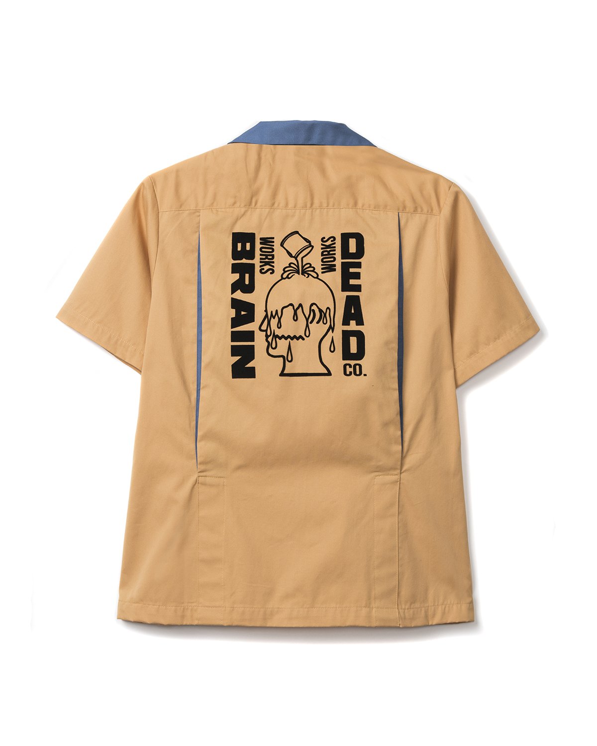 Bowling shirt Buildings print. For your warm days. Brain Dead Works back graphic. Front logotype green PVC patch. Model wears a size medium.