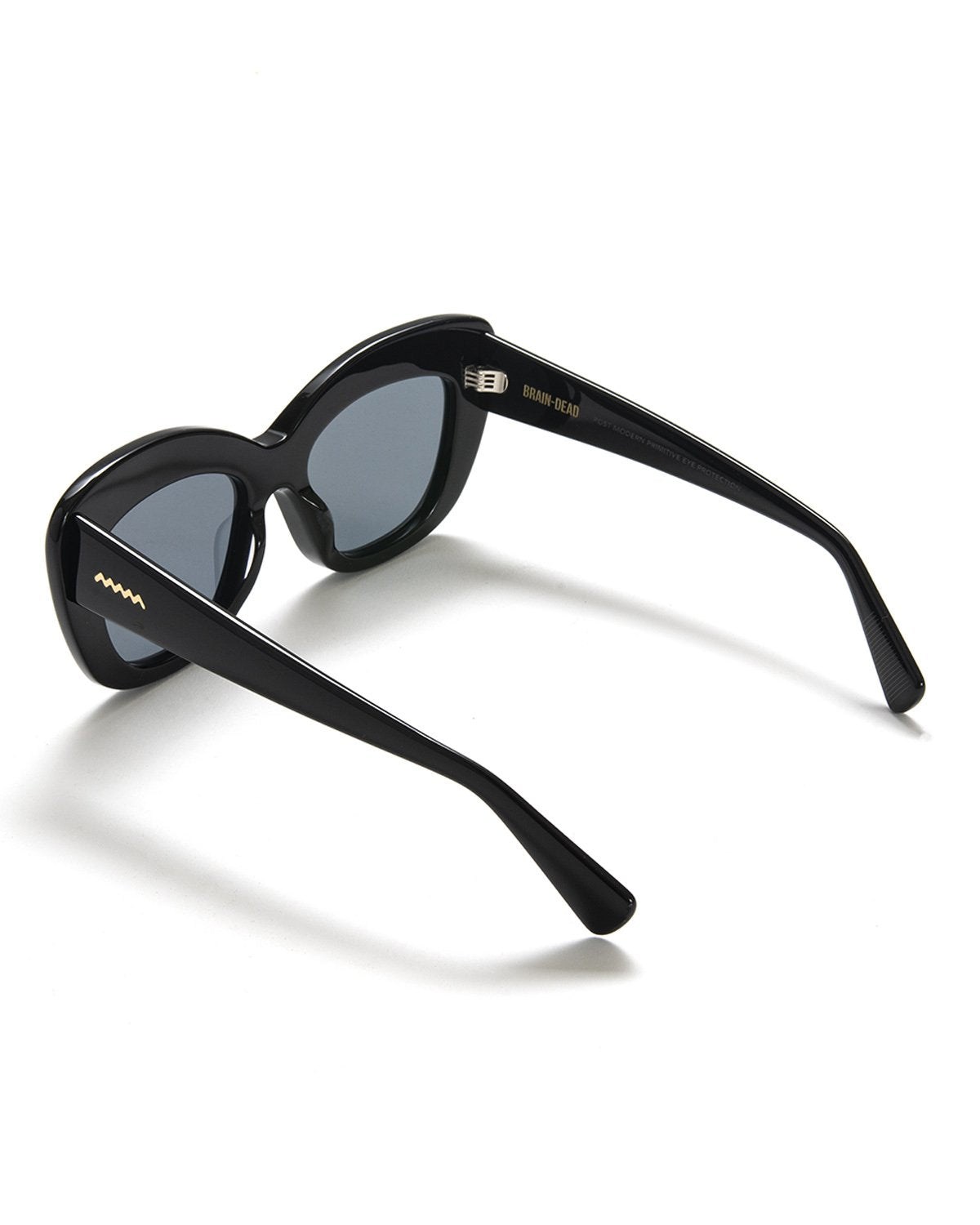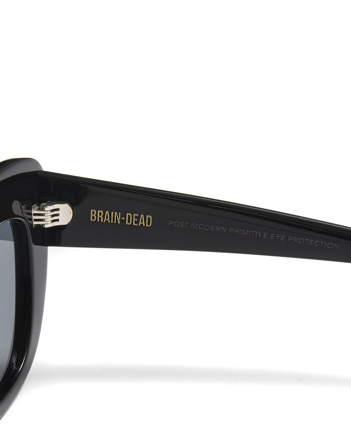 chibi handmade cellulose acetate frames (acetate is made from cotton & wood, is eco friendly, sustainably sourced & bio-degradable). Stainless steel cores for strength, flexibility and an adjustable fit. Extra sturdy and durable zinc-free barrel hinges. Optical-quality nylon lenses with 100% UV protection. Custom Brain Dead case and cloth included.