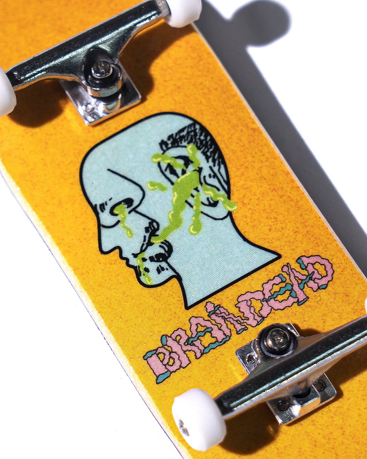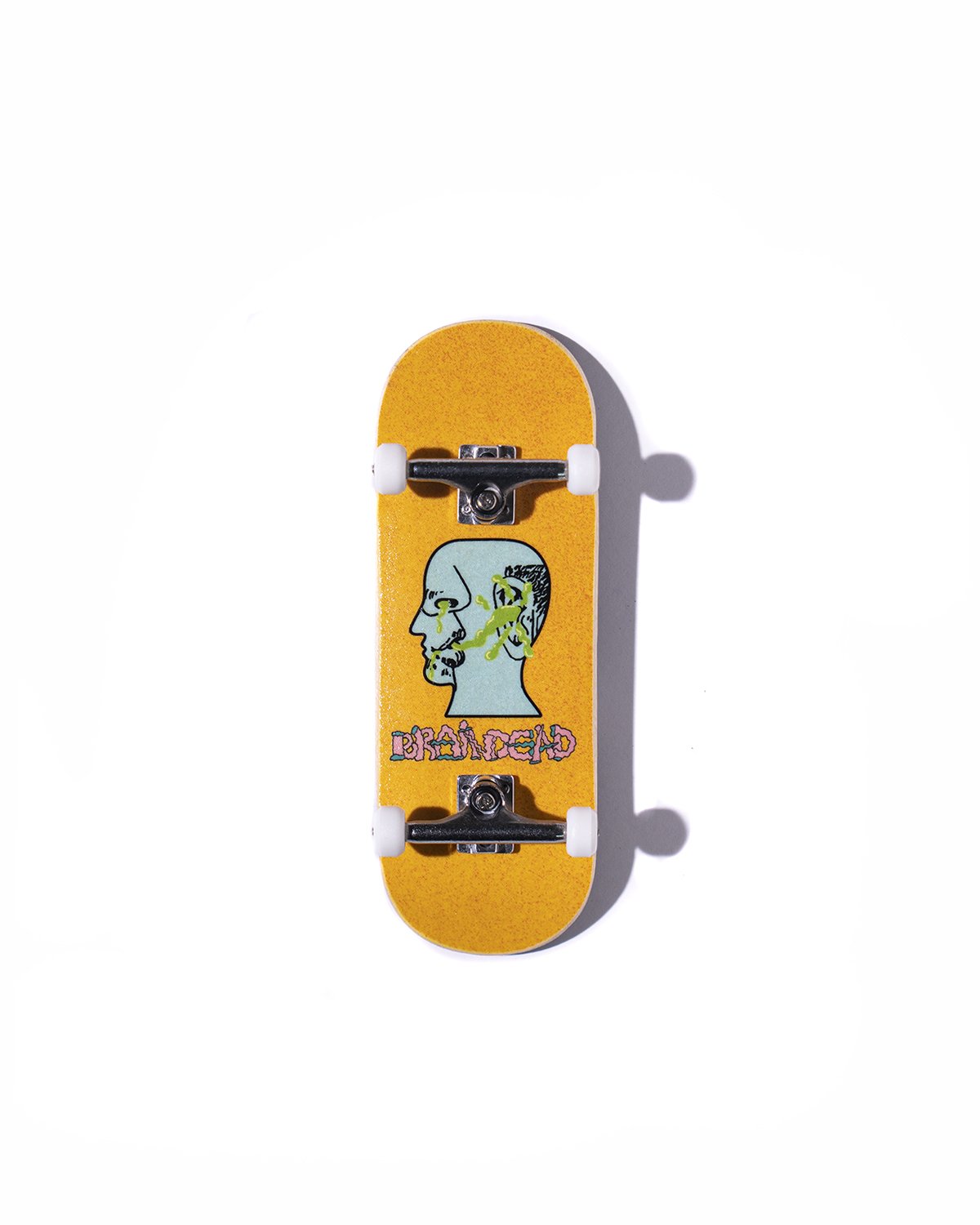 Cowply x Brain Dead c3 33.5mm deck. 5 ply maple deck molded and shaped in IL by John Cowart. Dynamic 34mm chrome trucks. Dynamic white urethane wheels. Cowply is a skater owned and operated fingerboard company. Ran by John Cowart, his background in design and love for art inspires his work as he makes his decks for the art of it. This miniature skateboard mimics a complete setup. Hand made by Cowply for Brain Dead. @cowply.jpeg www.cowply.com